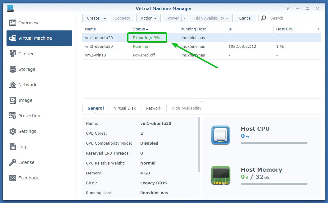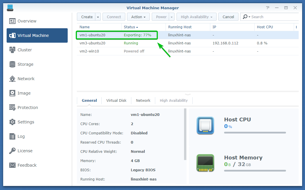 Virtual Machine Manager app should start exporting the virtual machine vm1-ubuntu20 to your selected Synology share. It may take a while to complete.