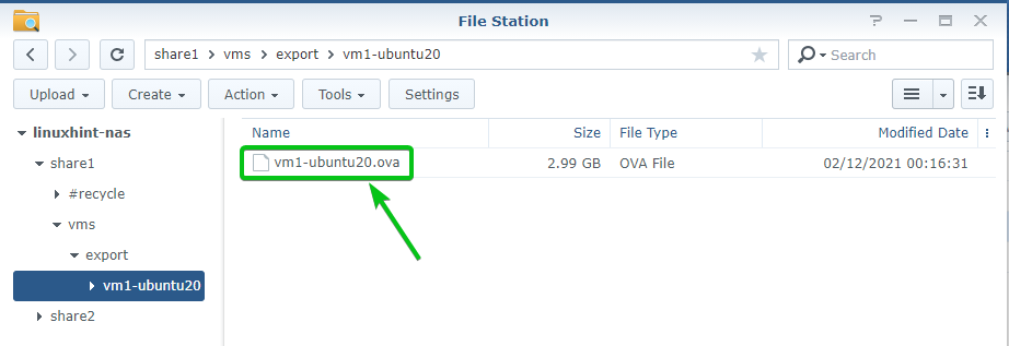 Once the virtual machine vm1-ubuntu20 is exported, a new OVA file should be created in the vm1-ubuntu20/ directory of your Synology NAS share, as you can see in the screenshot below.