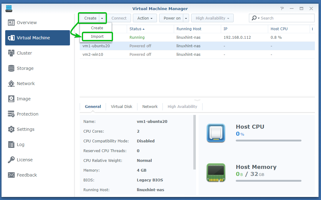 To import a virtual machine, click on Create > Import, as marked in the screenshot below.