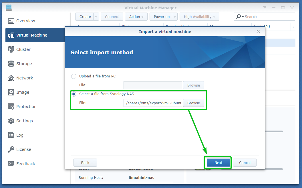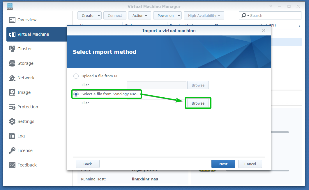 To select the OVA file from your Synology NAS share, select Select a file from Synology NAS and click on Browse, as marked in the screenshot below.