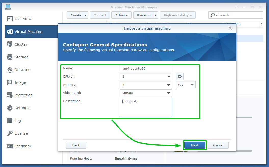 I am going to call the imported virtual machine vm4-ubuntu20, and allocate 2 CPU cores and 4 GB of memory to it.
