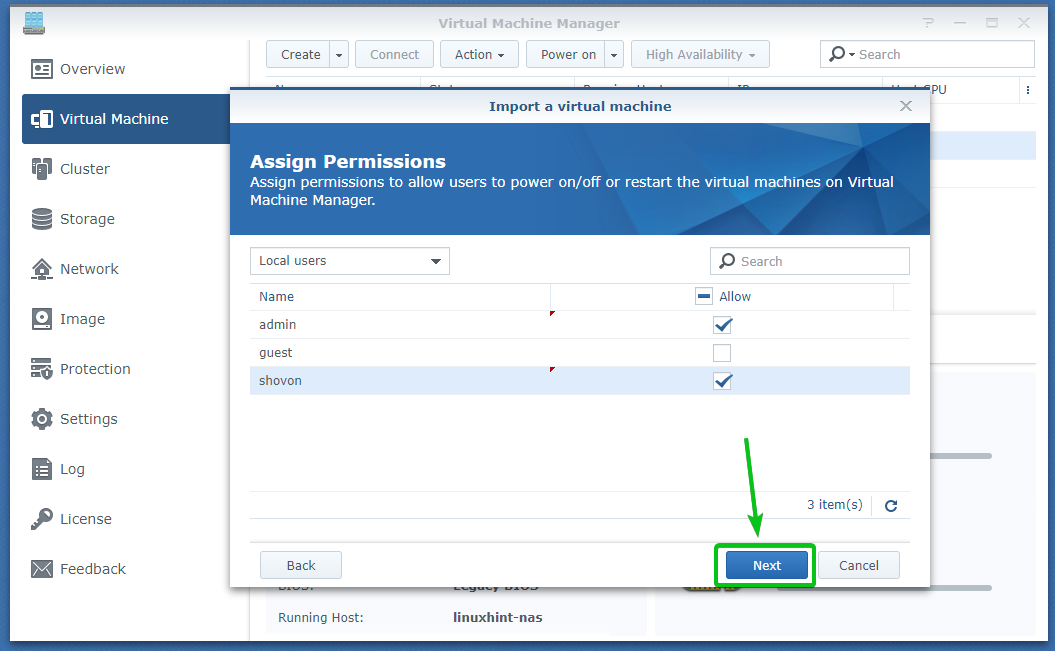 Select the users that you want to allow access to the imported virtual machine and click on Next.
