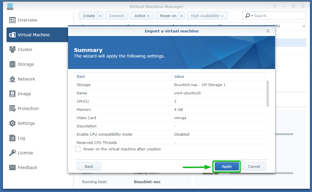 The settings that will be used to import and create the virtual machine should be displayed. To import and create a virtual machine with those settings, click on Apply.