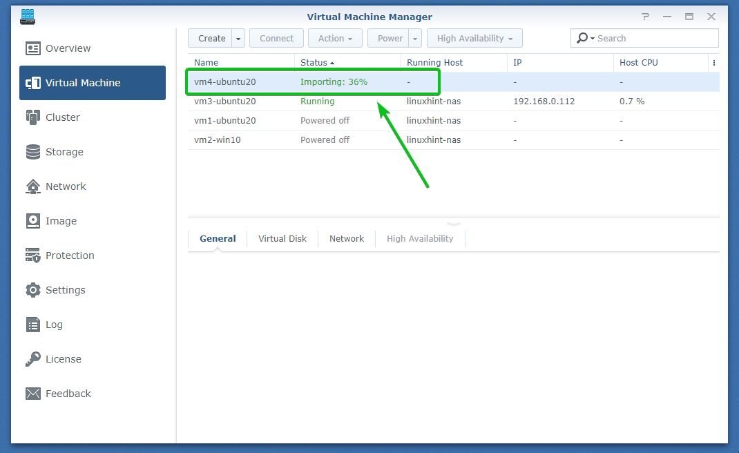 The virtual machine vm4-ubuntu20 is being imported, as you can see in the screenshot below. It may take a few minutes to complete.