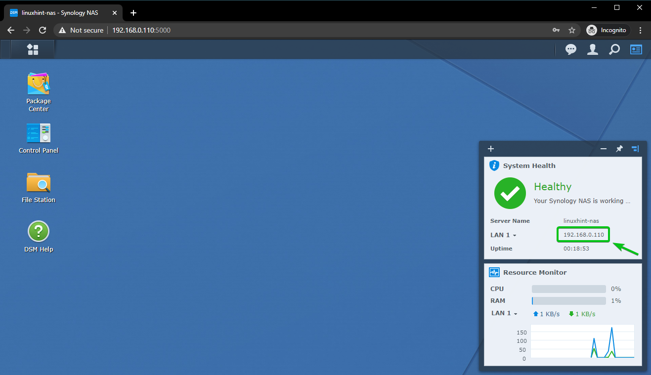 To access your Synology NAS shares, you need to know the IP address of your Synology NAS. You can find it from the Synology Web GUI. As you can see, the IP address of my Synology NAS is 192.168.0.110. It will be different for you. So, make sure to replace it with yours from now on.