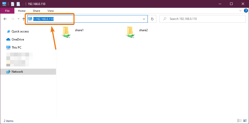 From Windows 10 operating system, navigate to \\192.168.0.110 from the File Explorer app to access the Synology NAS shares.
