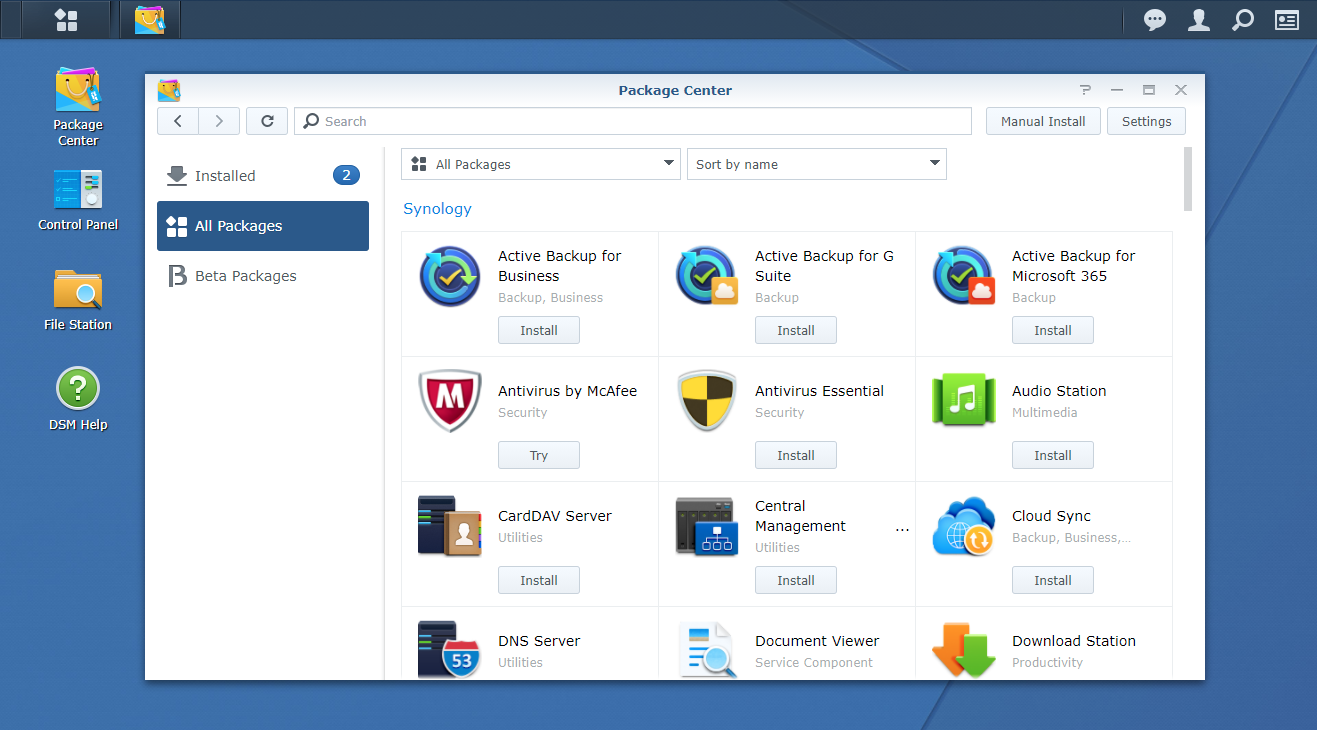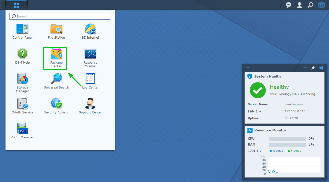 Open the Package Center app from the Synology Web GUI, as marked in the screenshot below.