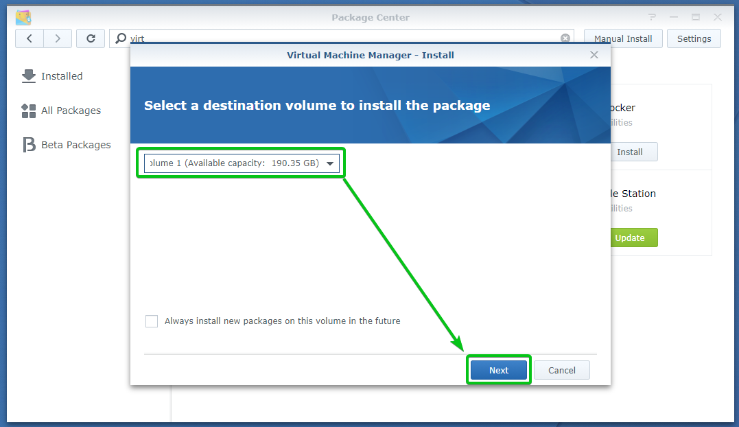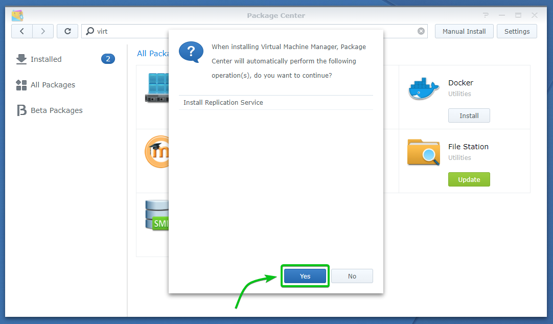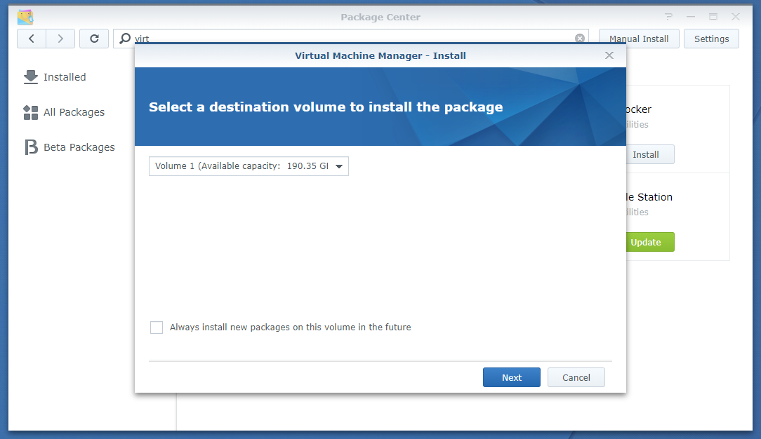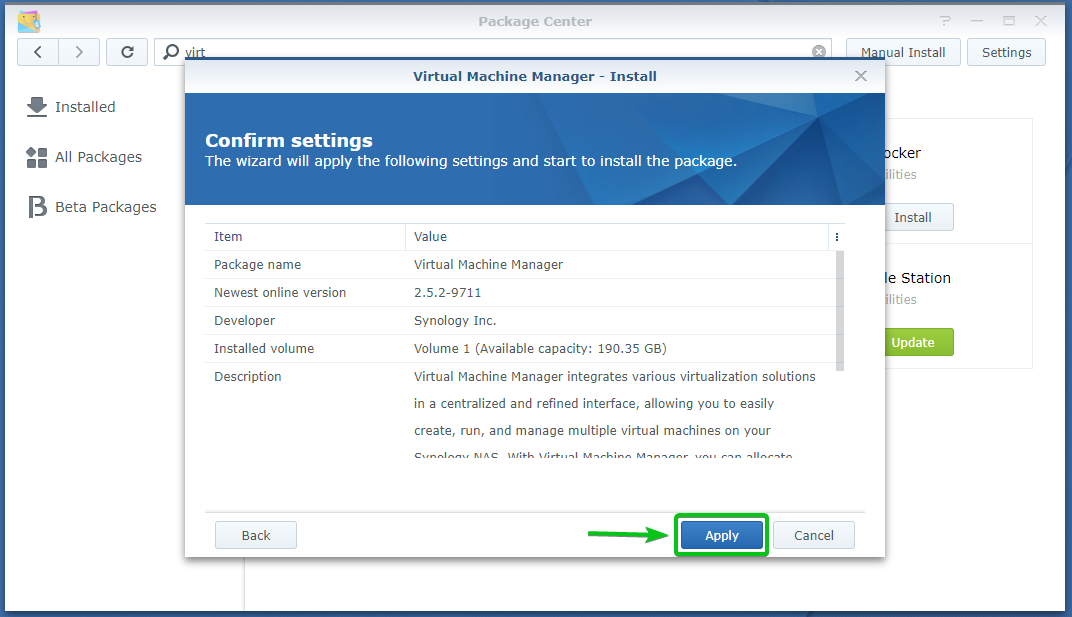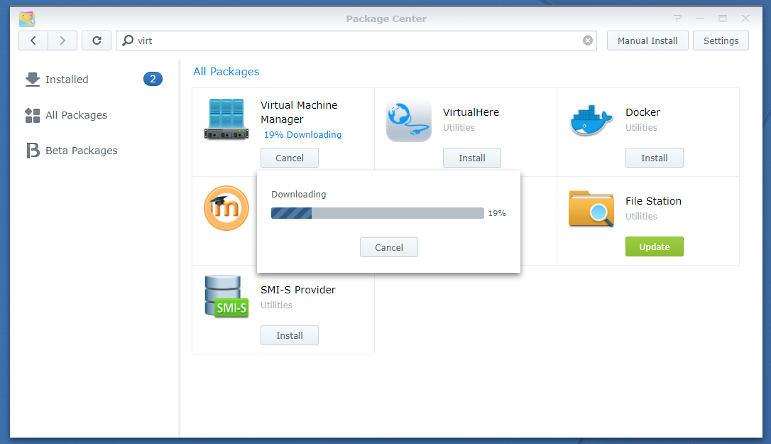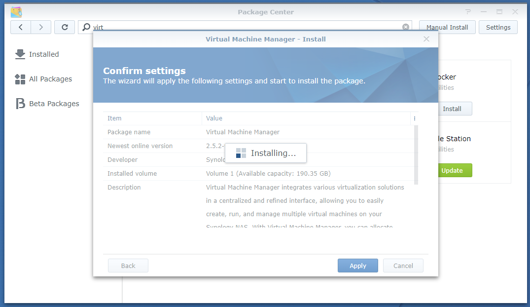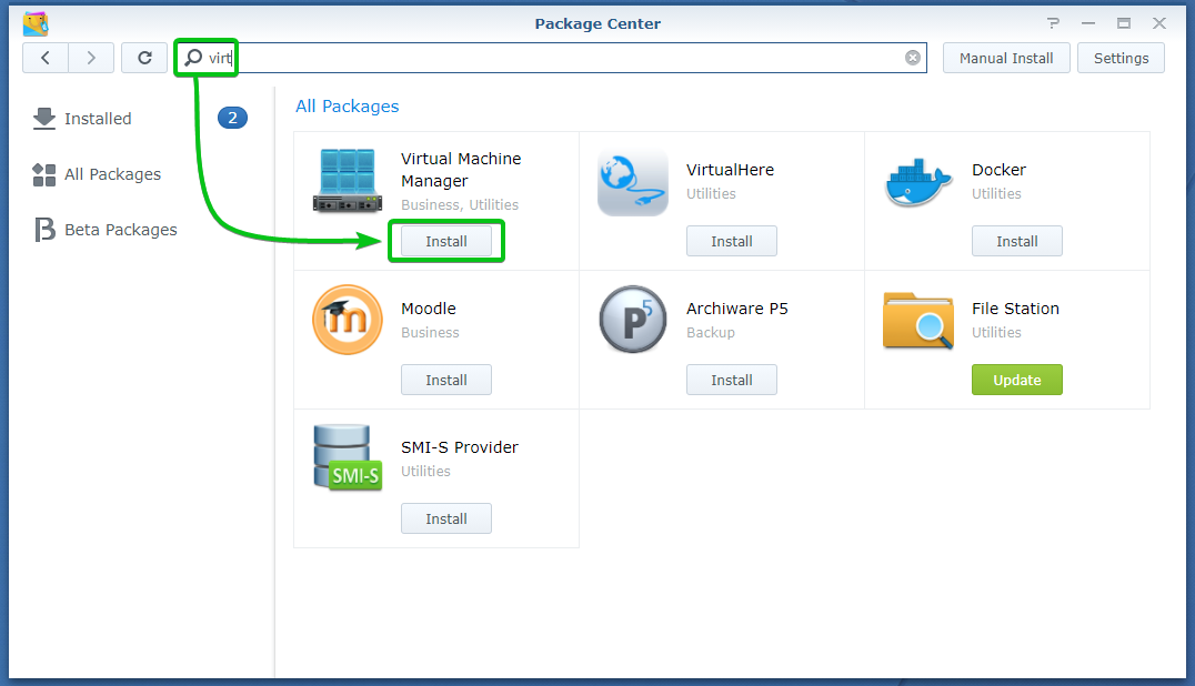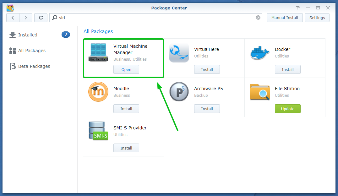 To create virtual machines on your Synology NAS, you need to install the Virtual Machine Manager app on your Synology NAS. The Virtual Machine Manager app is available in the Package Center of your Synology NAS.
