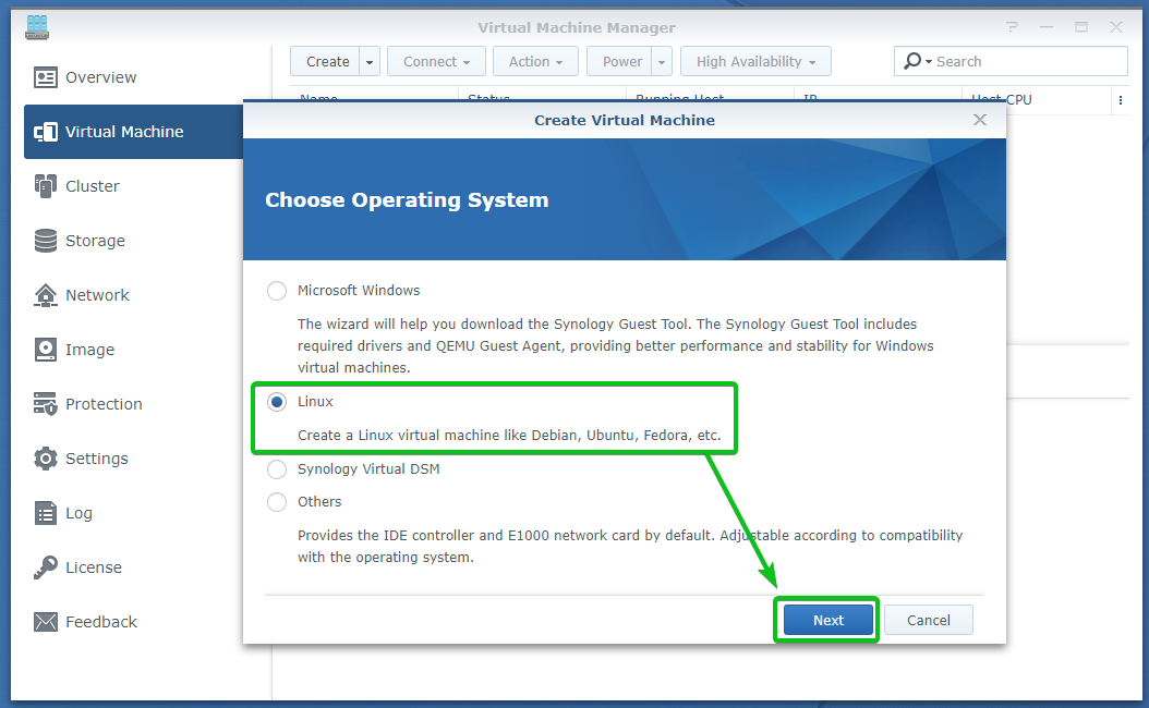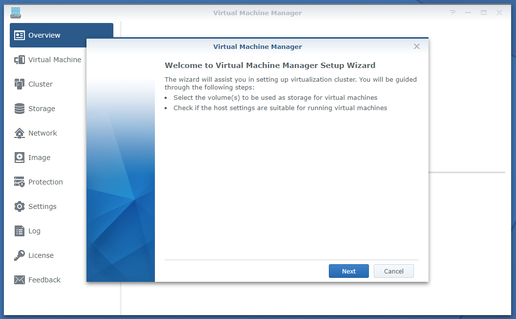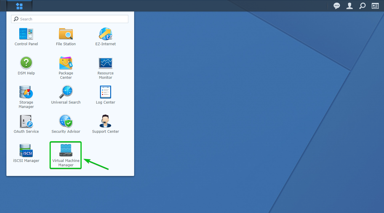 Once the Virtual Machine Manager app is installed, start the Virtual Machine Manager app from the Main Menu of Synology Web GUI.
