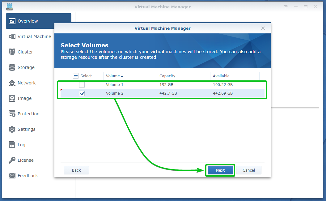 Select a volume or multiples volumes where you want to store your virtual machine data and click on Next.