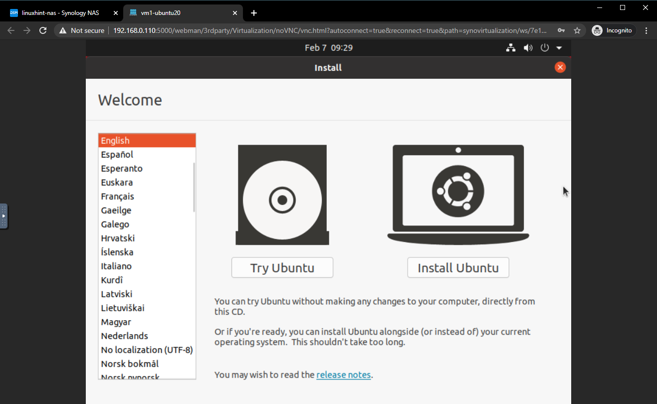 The Ubuntu 20.04 LTS installer should be loaded by the time you connect to the virtual machine. You can install Ubuntu 20.04 LTS on the virtual machine from here.