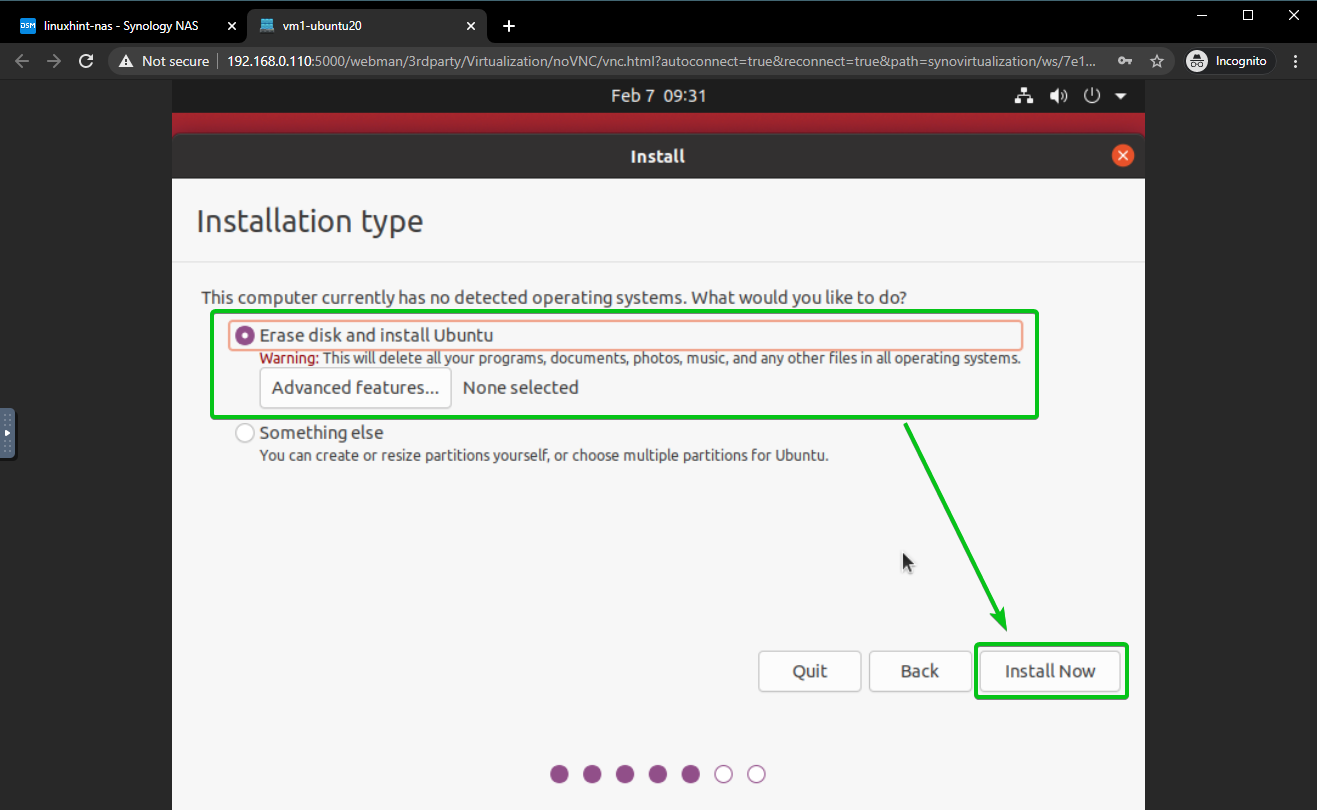 So, select Erase disk and install Ubuntu and click on Install Now.