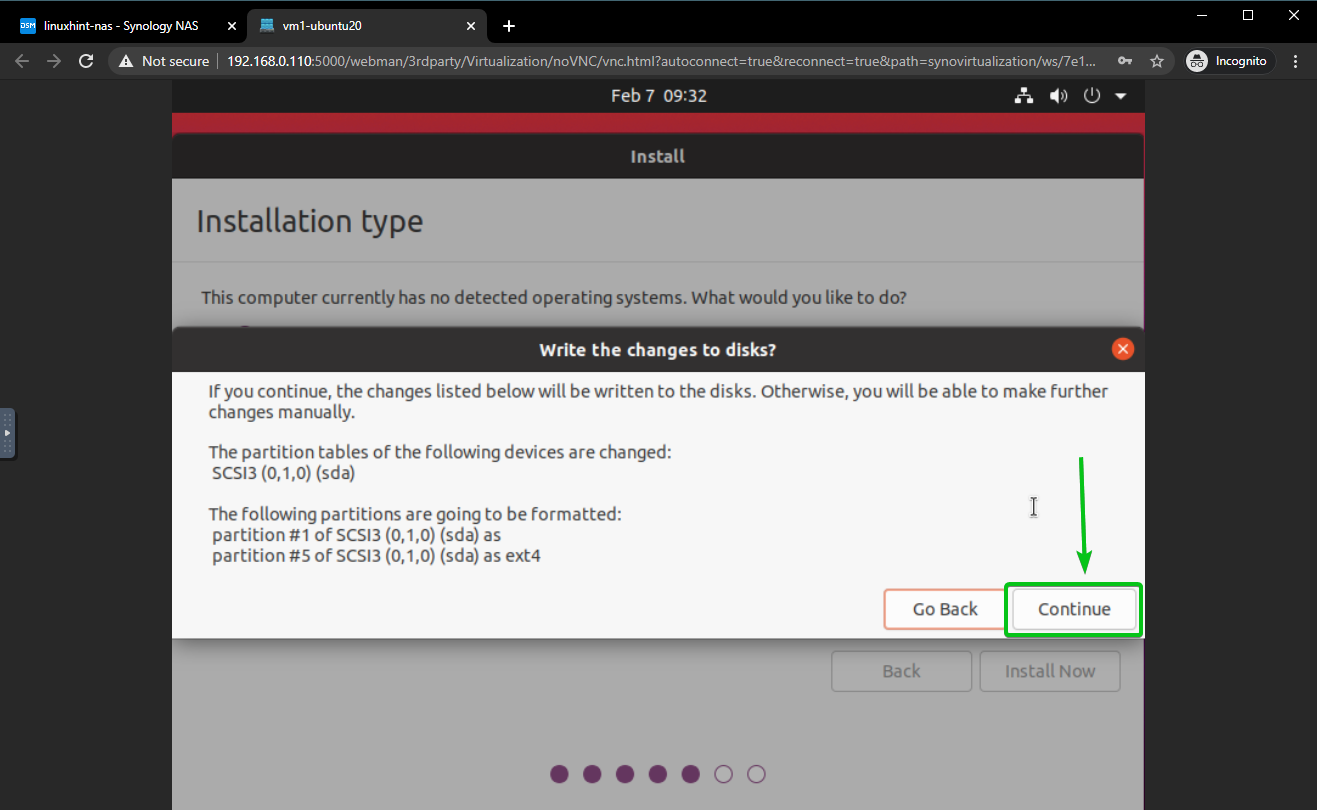 The Ubuntu 20.04 LTS installer will automatically create all the required partitions, and it will ask you whether you would like to save the changes to the disk.