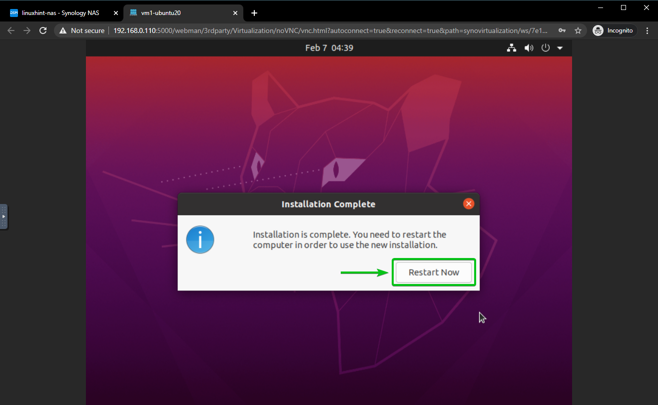Once Ubuntu 20.04 LTS is installed, click on Restart Now.