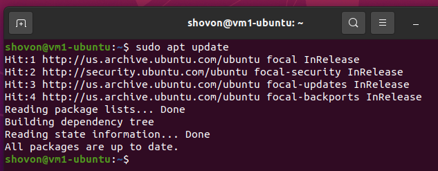 Open a Terminal on your Ubuntu 20.04 LTS virtual machine and run the following command to update the APT package repository cache: