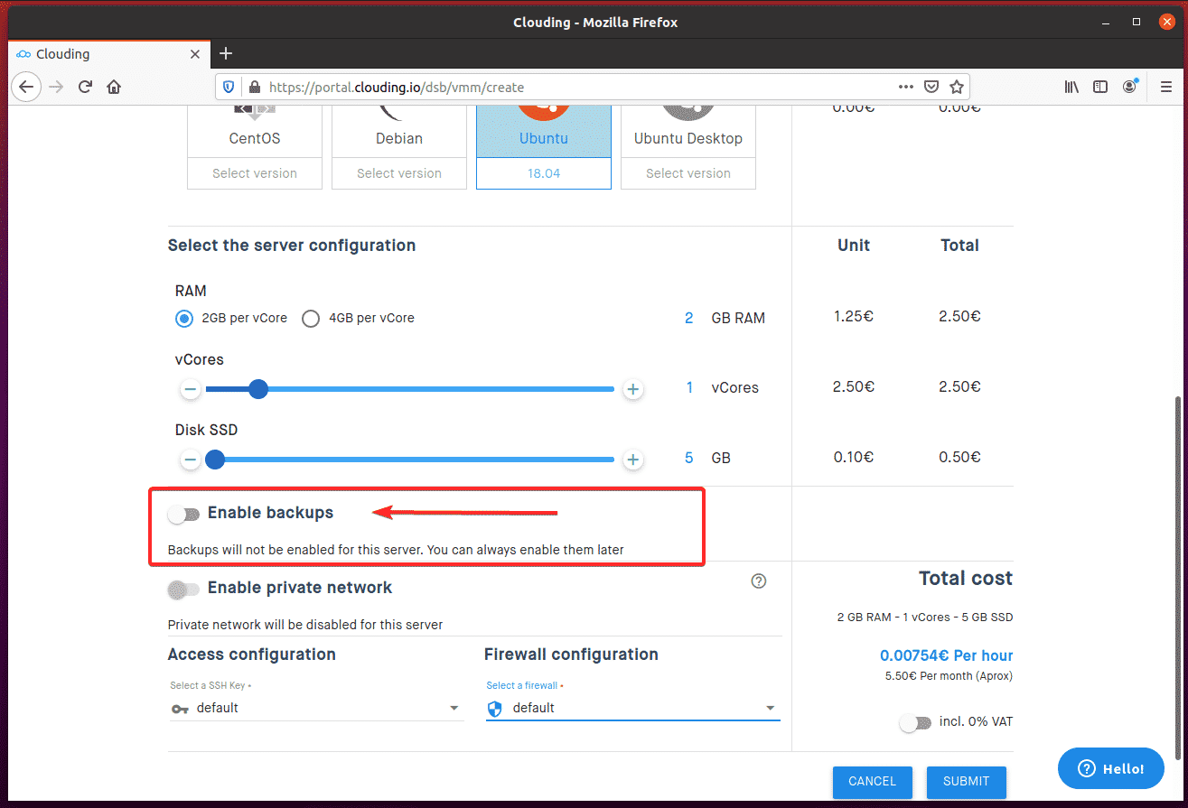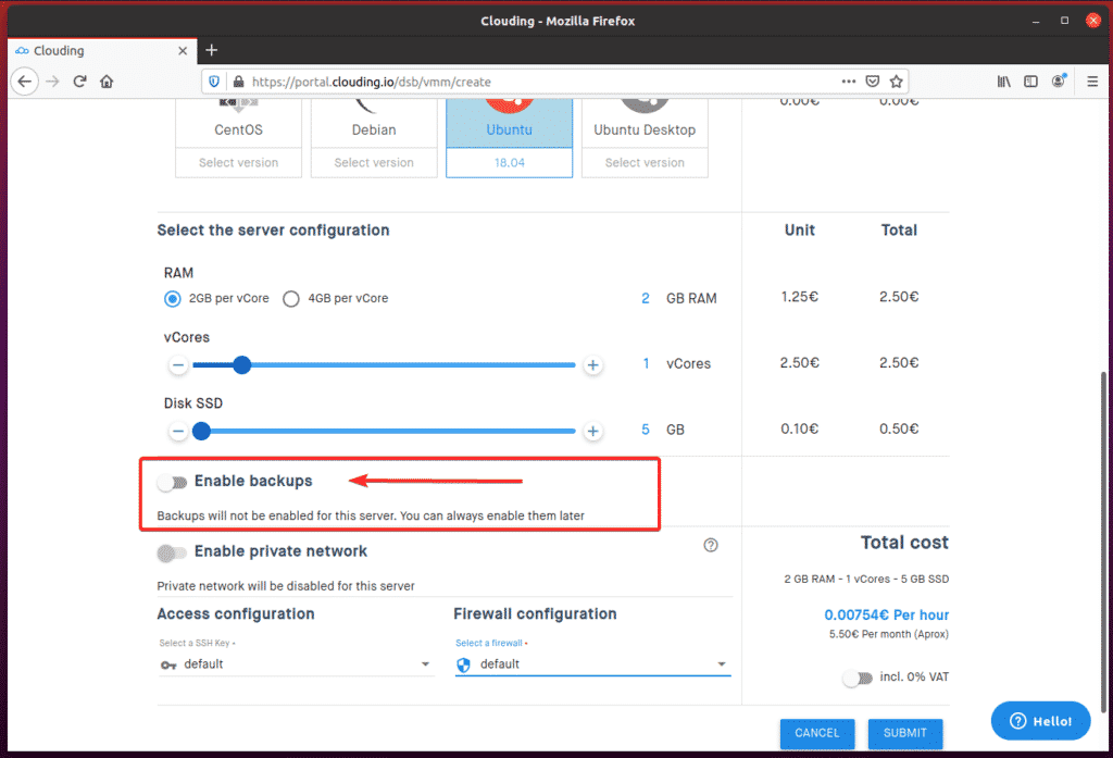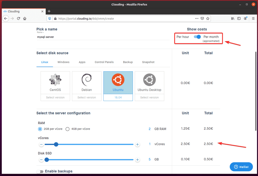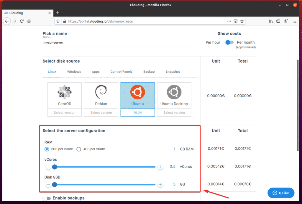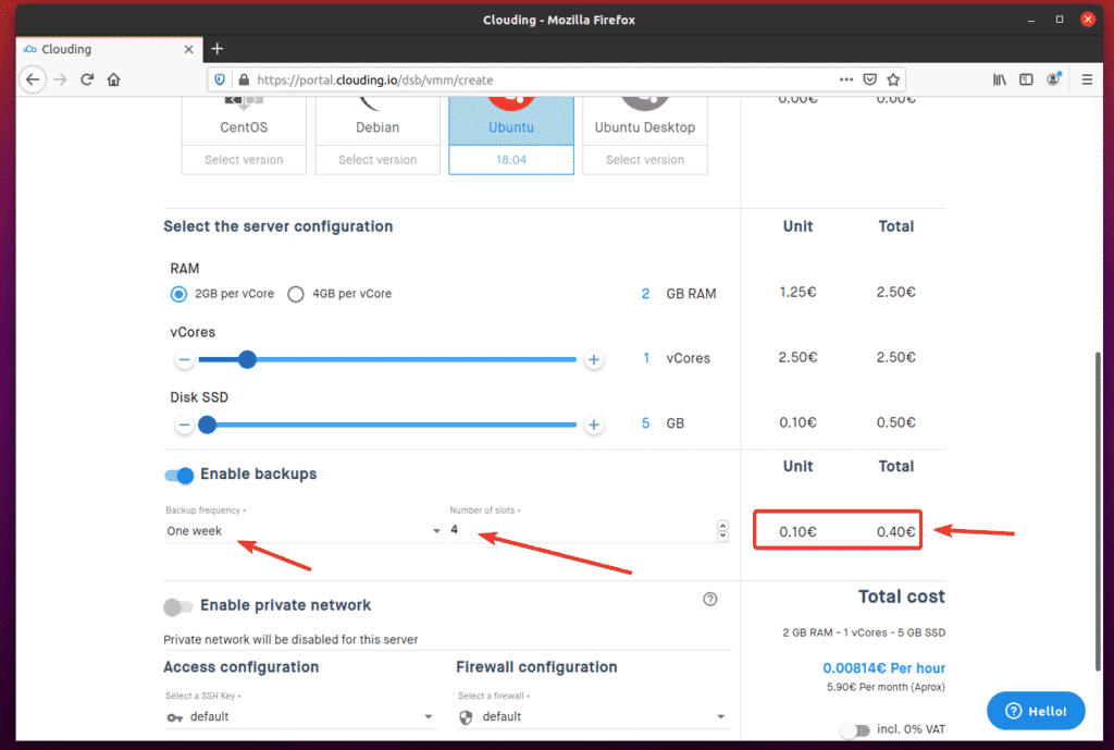 Then, you can select the Backup frequency and number of backups (Number of slots) you would like for Clouding.io to keep in the dropdown menus. The cost of the backup will be displayed on the righthand side of the screen.