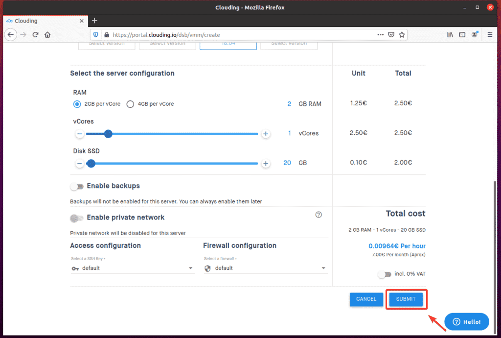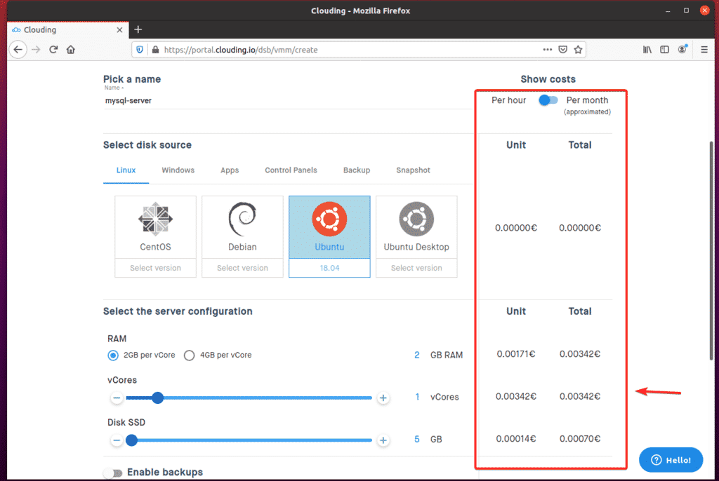 The cost of your VPS per hour should be displayed on the right-hand side of the page, as you can see in the screenshot below.