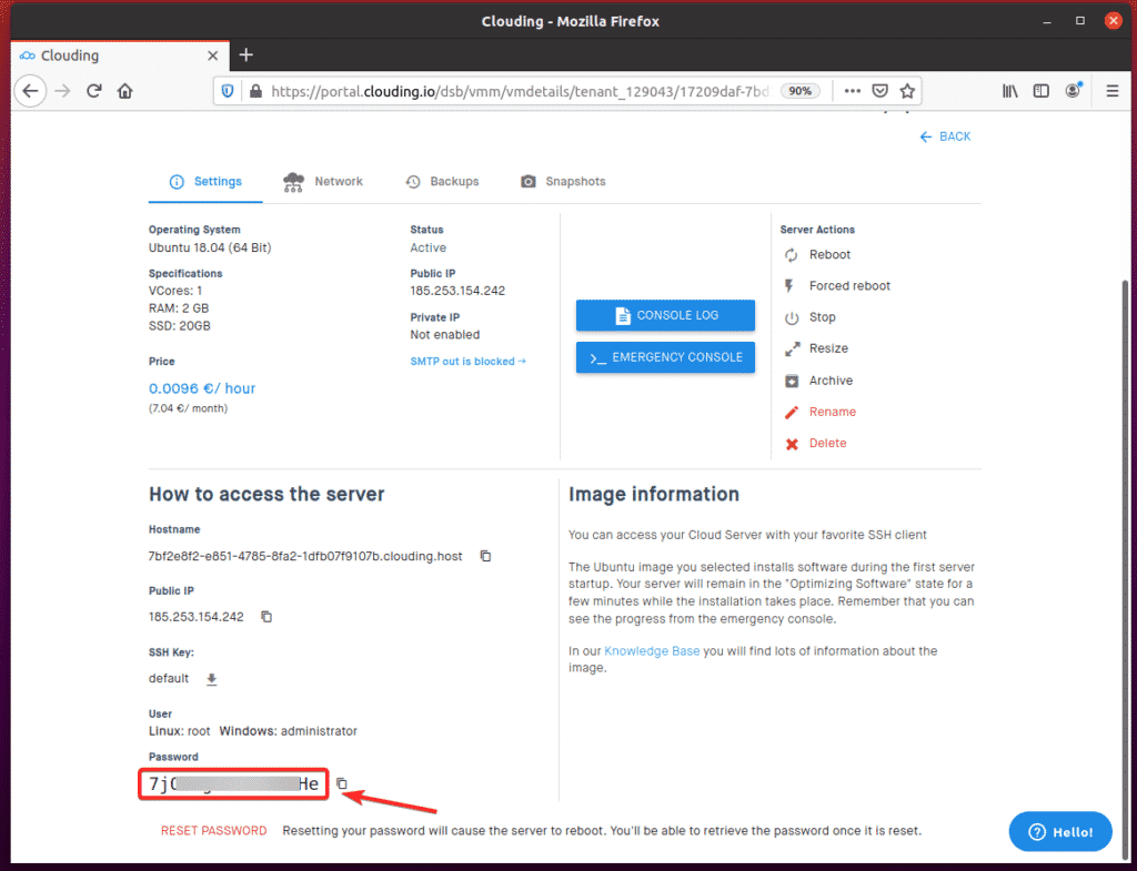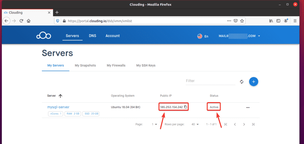 Once the VPS is ready, Clouding.io will assign a public IP to the VPS and the Status should be Active, as you can see in the screenshot below.