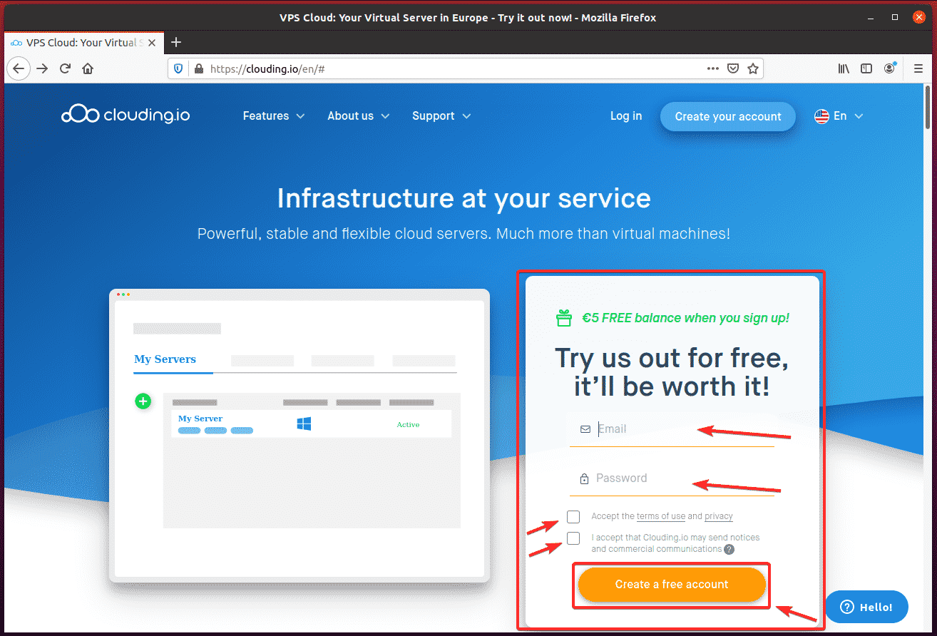 Then, click the button that says, “Create a free account.” Your Clouding.io account should now be set up and active.