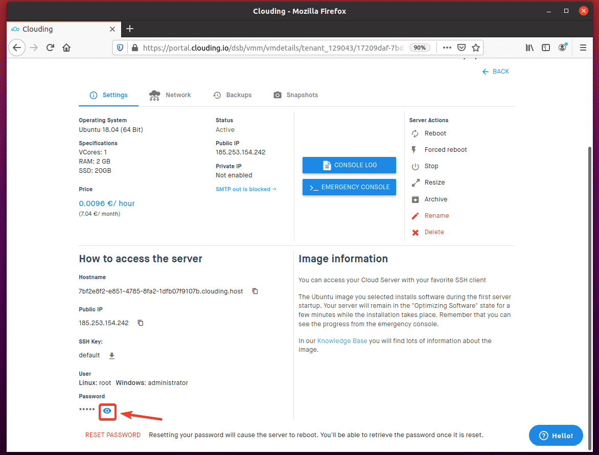 Scroll down a bit and click the eye icon to see the root password of the VPS, as marked in the screenshot below.