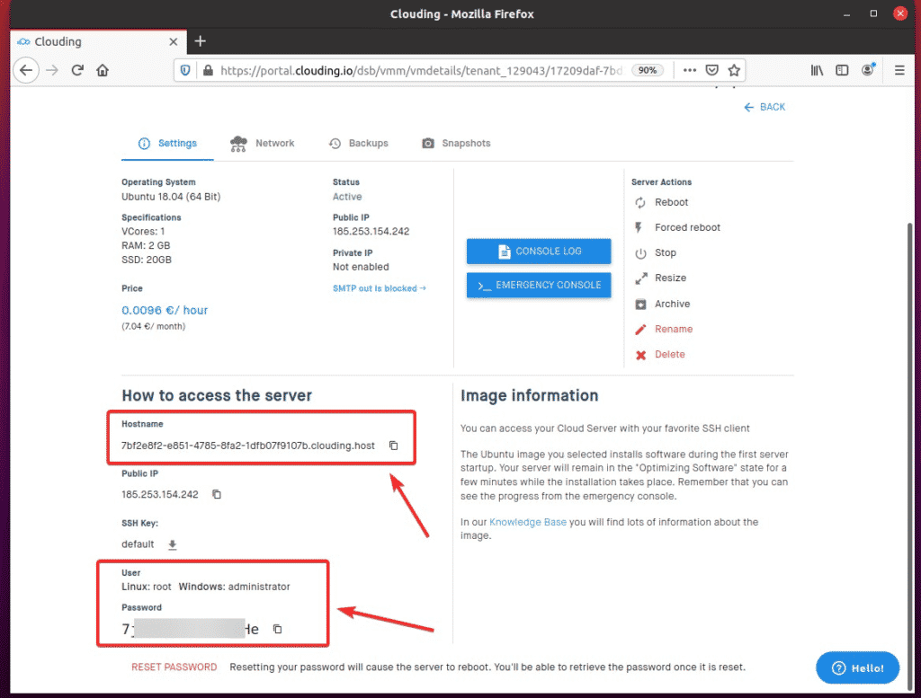 To connect to the VPS via SSH, you will need the Hostname and the Password of the VPS. You can copy this information from the Settings page, as shown in the screenshot below. The Username in this example is root.