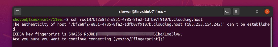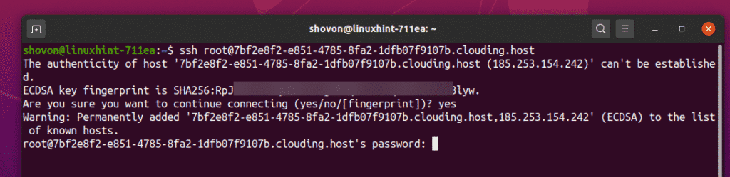 Type “yes” and press <Enter> to accept the SSH key.