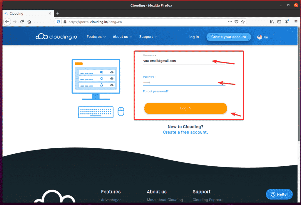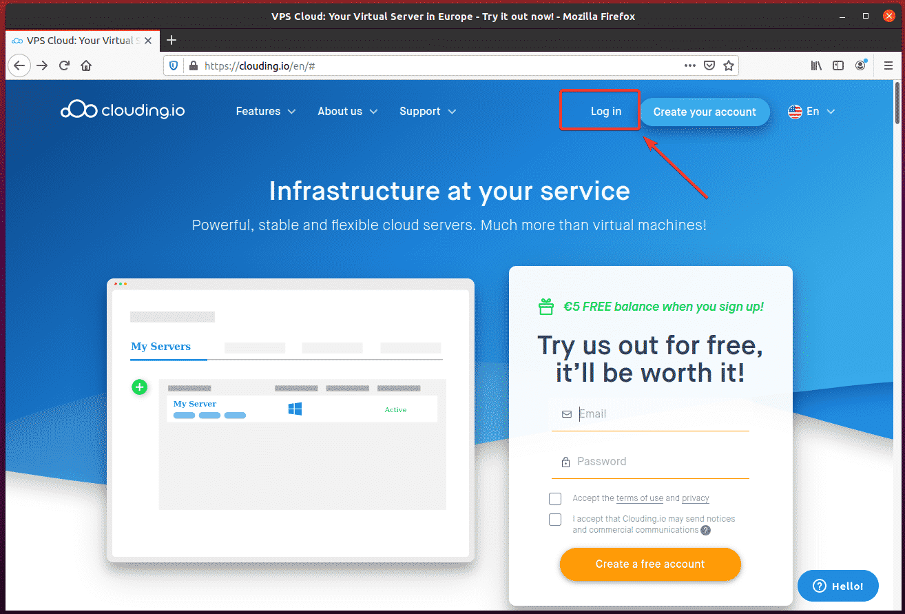 Once your account is created, click “Log in” from the Clouding.io homepage.