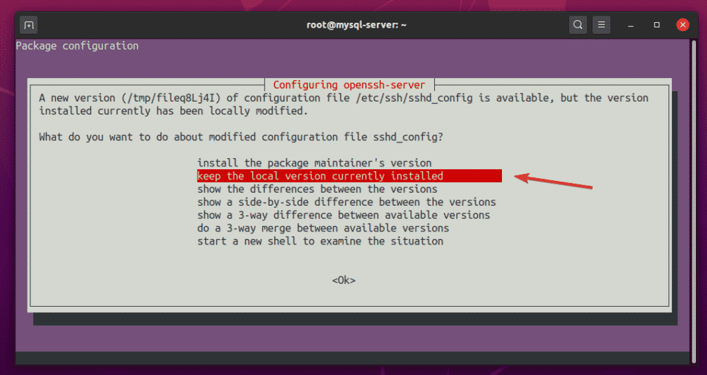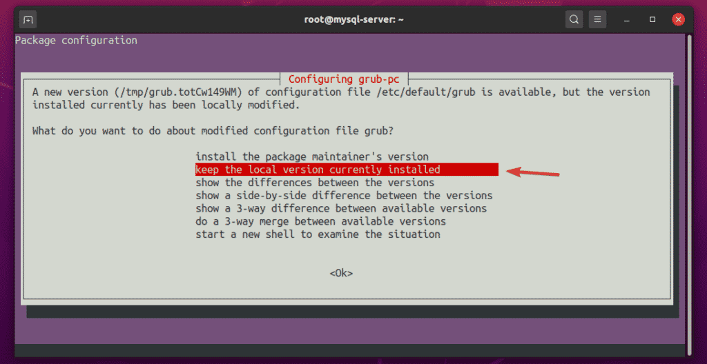 Select “keep the local version currently installed” and press <Enter>.