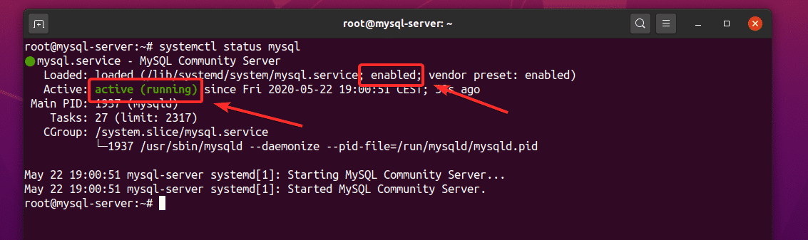 The mysql service should be active (running) and enabled (will automatically start on boot), as shown in the screenshot below: