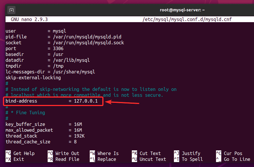 Replace the line bind-address = 127.0.0.1, as shown in the screenshot below.