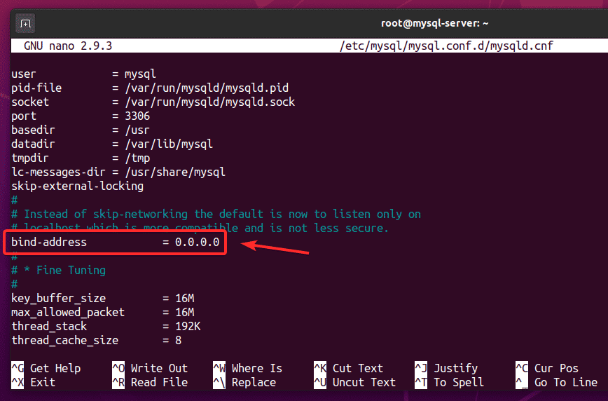 Change it to bind-address = 0.0.0.0, as shown in the screenshot below.