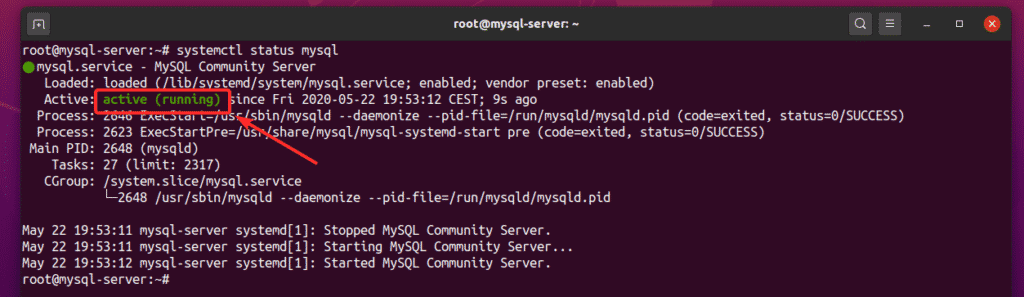 The mysql service should be active (running).