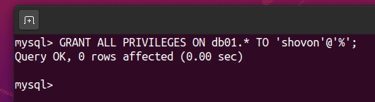 Allow the remote user shovon full access to the db01 database as follows: