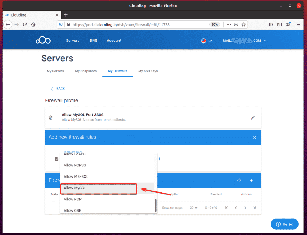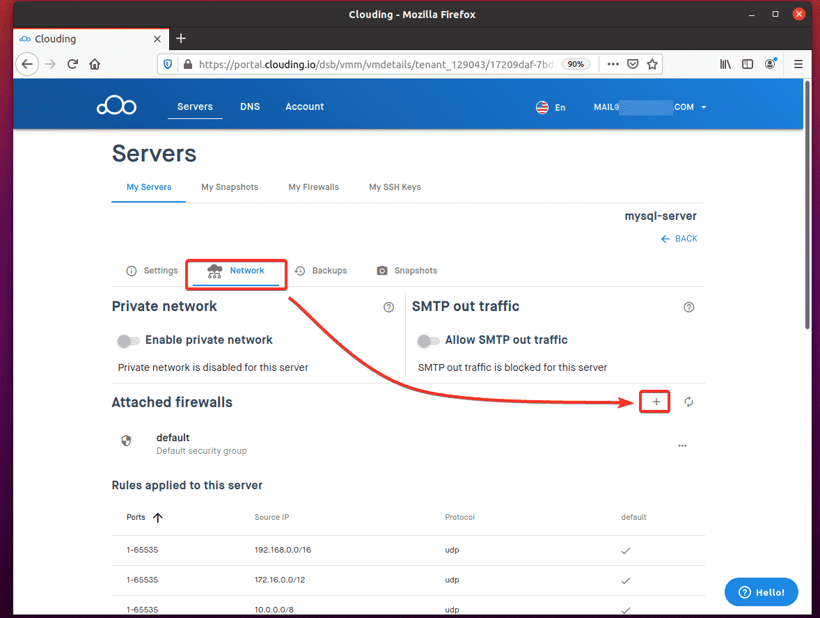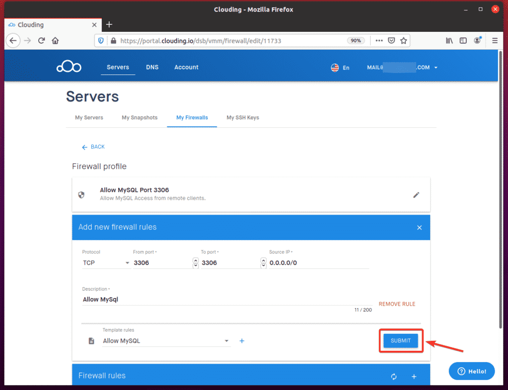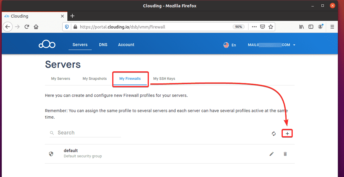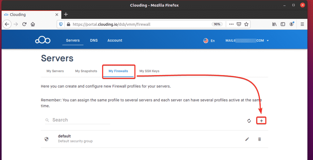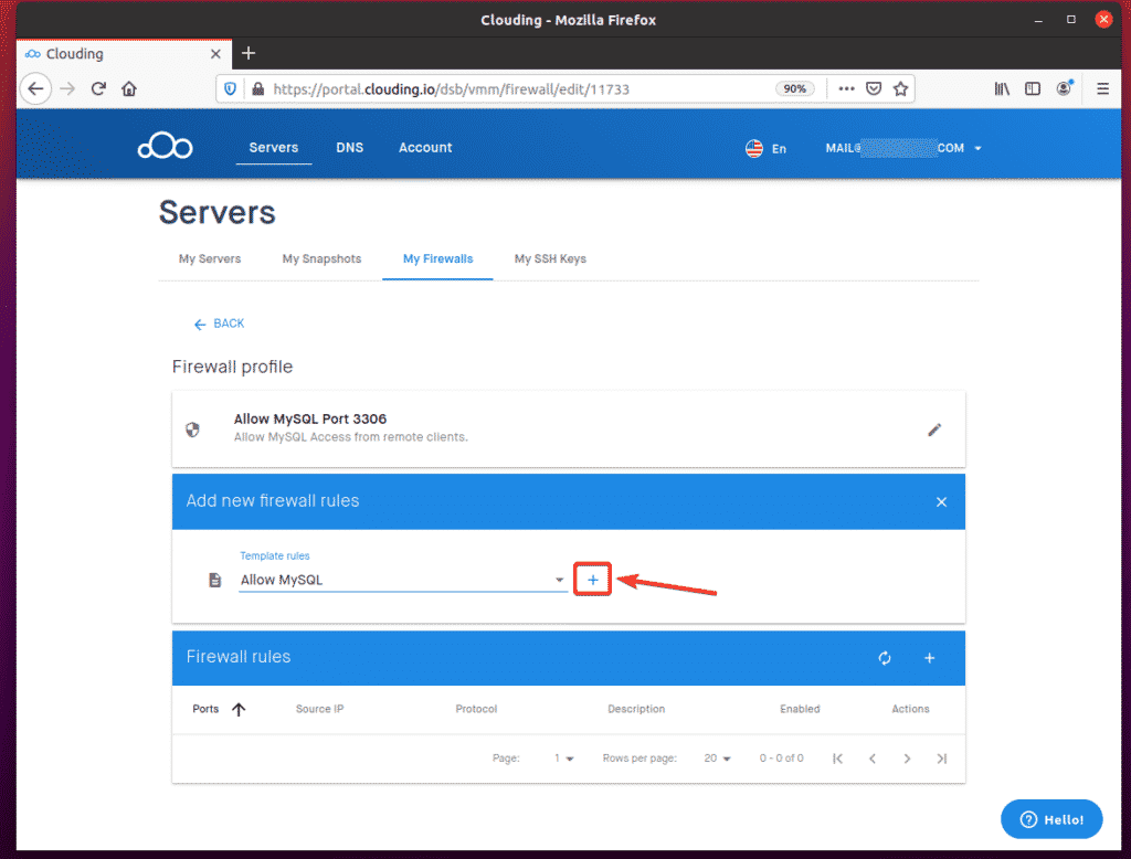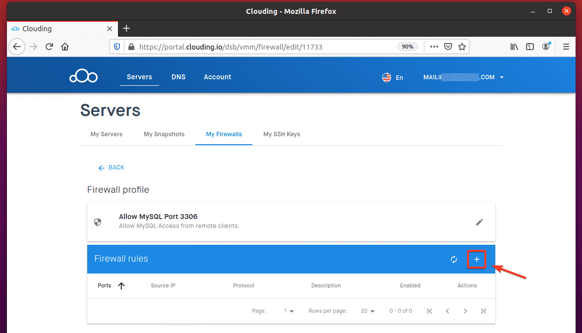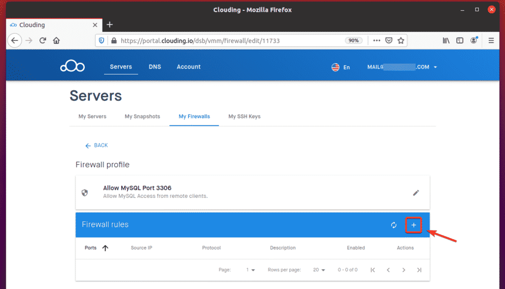 To allow remote access to TCP port 3306, navigate to My Firewalls from the Clouding.io dashboard and click the + button, as indicated in the screenshot below.
