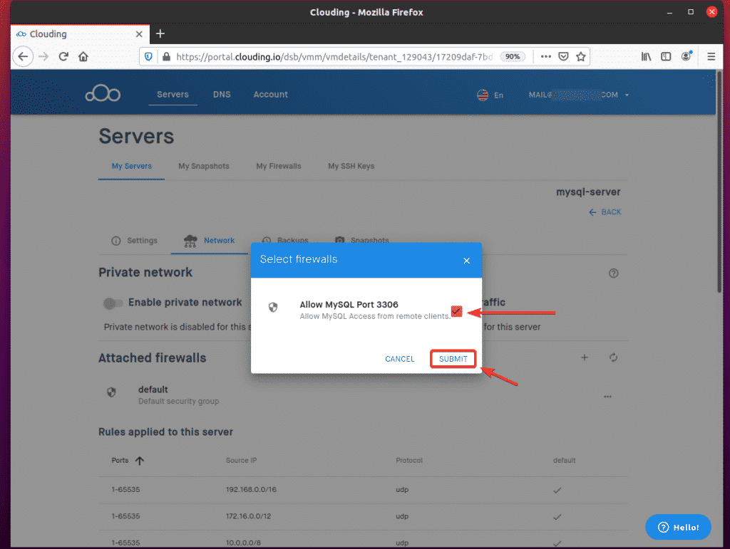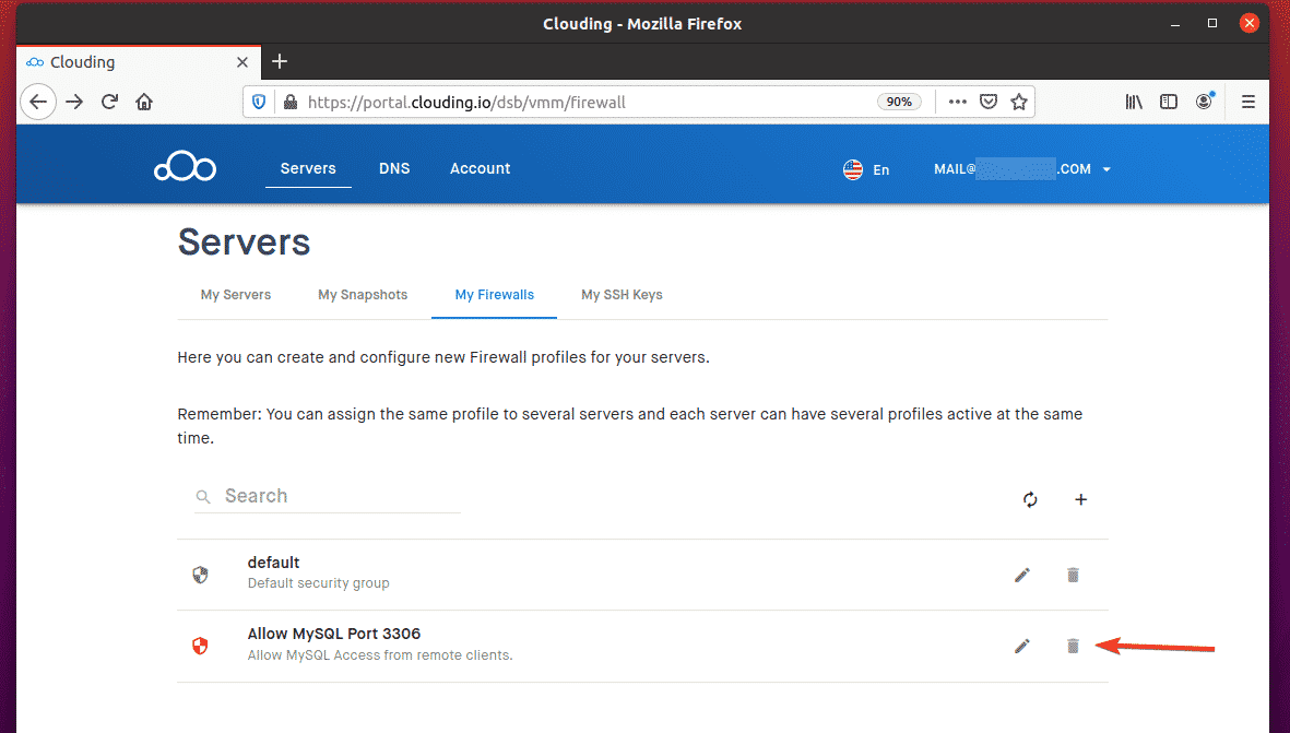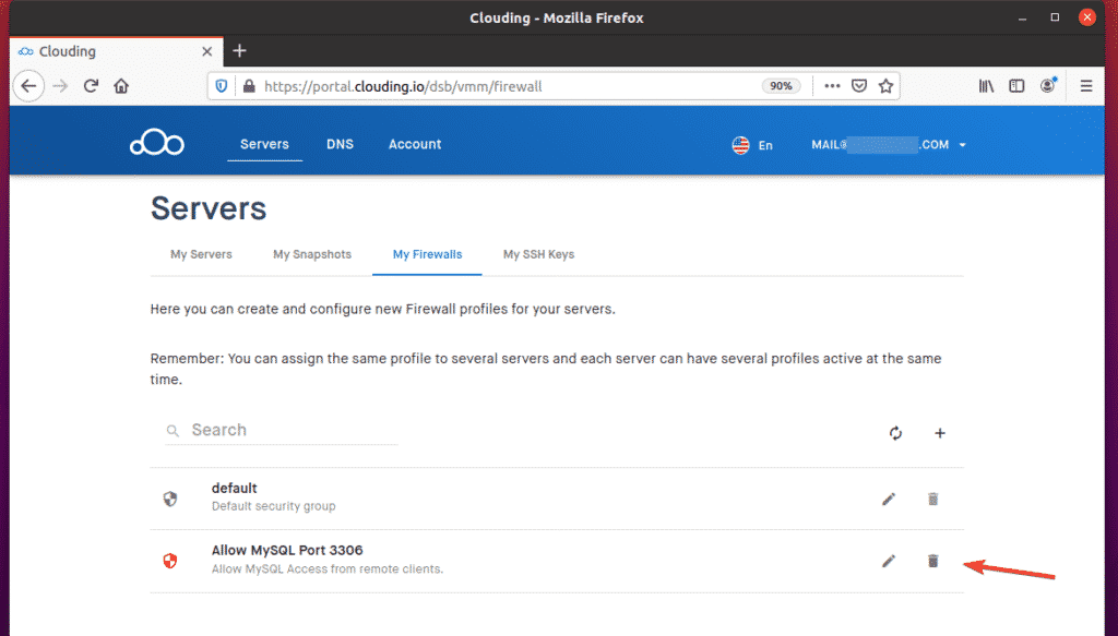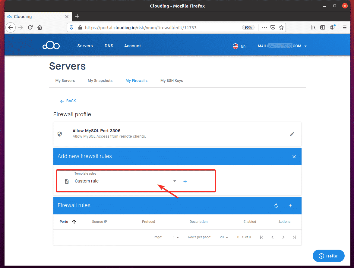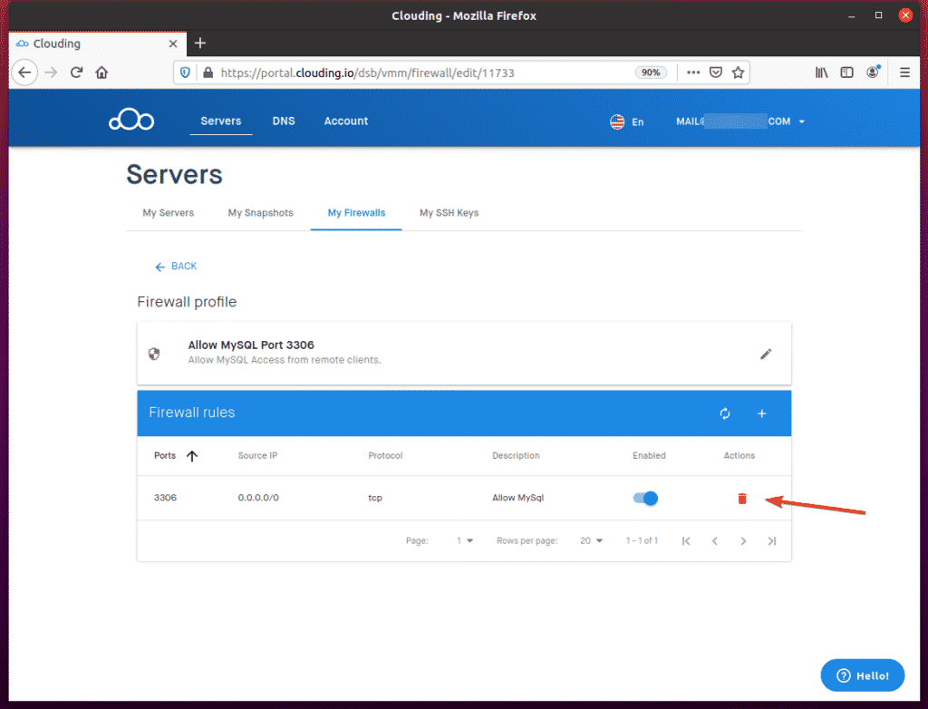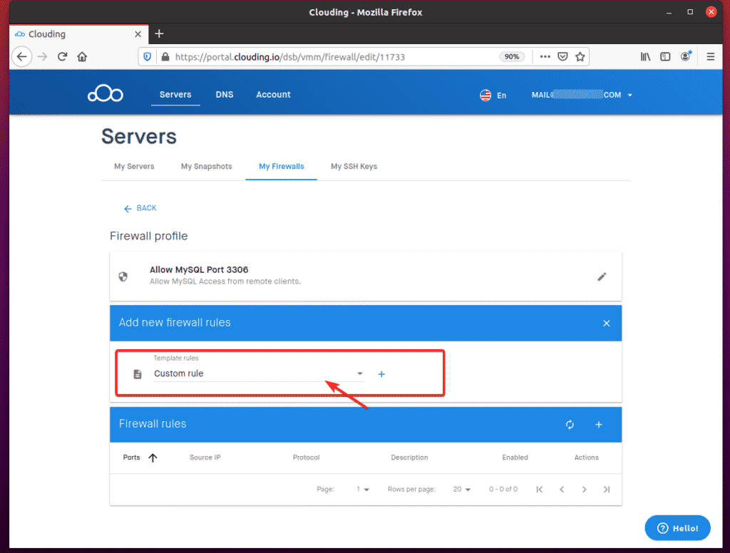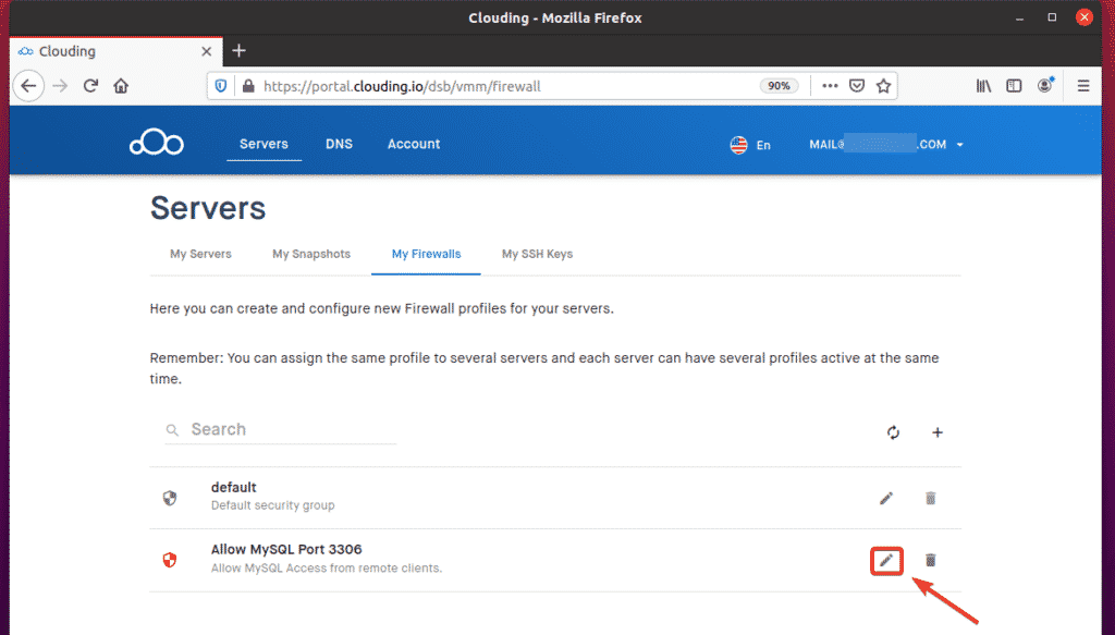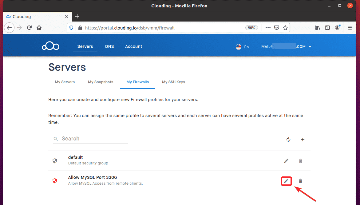 To allow remote access to TCP port 3306, navigate to My Firewalls from the Clouding.io dashboard and click the + button, as indicated in the screenshot below.