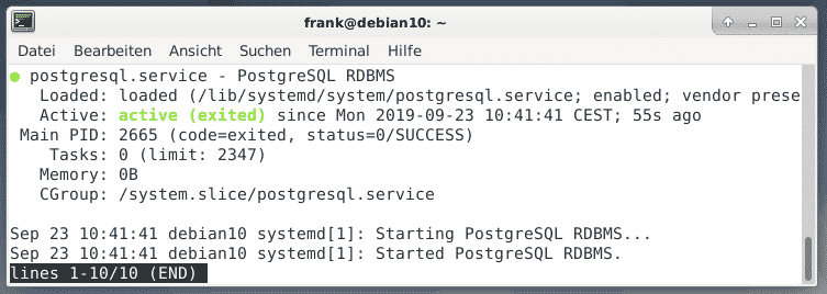 These lines lead to the installation of the postgresql package (plus package dependencies), and enabling the according service. In order to check the PostgreSQL service for being running, this command should give you a positive output, then: