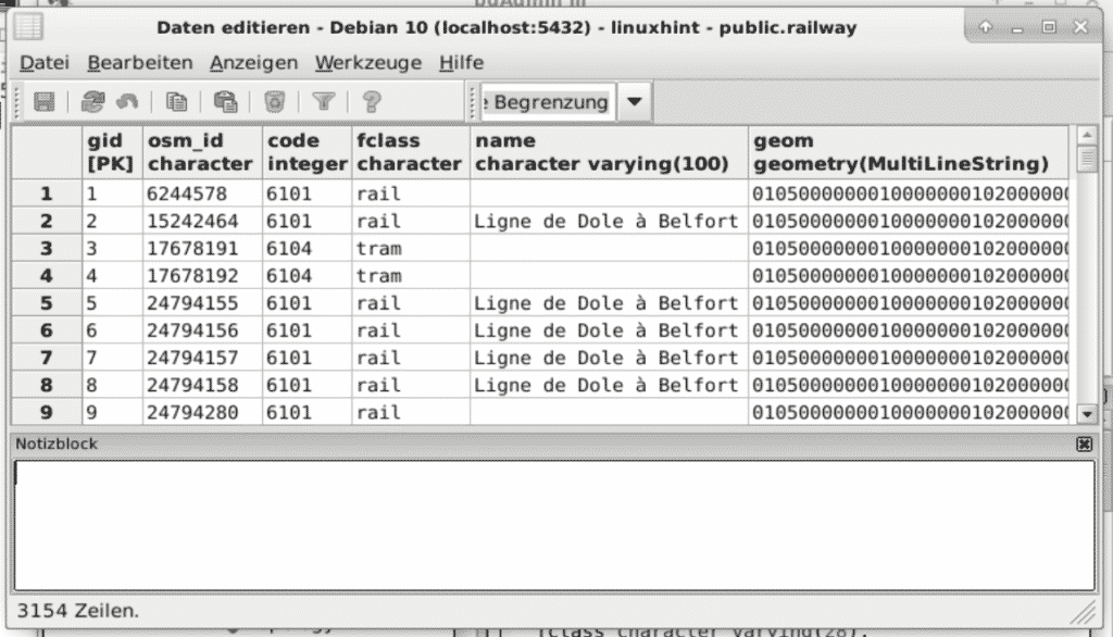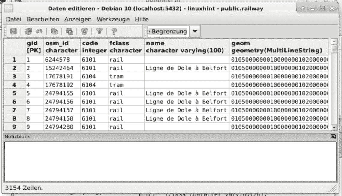 Now, PostgreSQL/PostGIS is at your service, and ready to recieve your SQL queries. For example, pgadmin allows you a look under the hood within minutes. The figure below shows this for the uploaded data. The rightmost column has a geometric type MultiLineString.