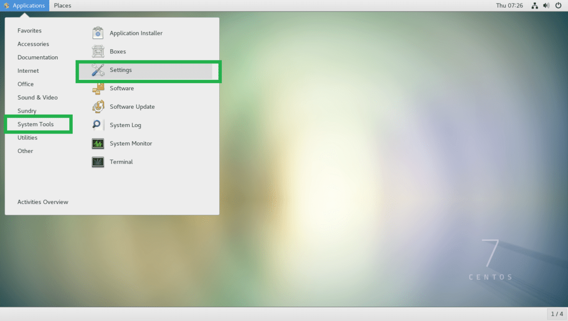 First you have to go to the Settings. You can find the Settings app in the System Tools section of the Applications menu as marked in the screenshot below.