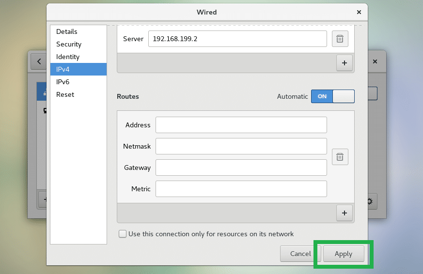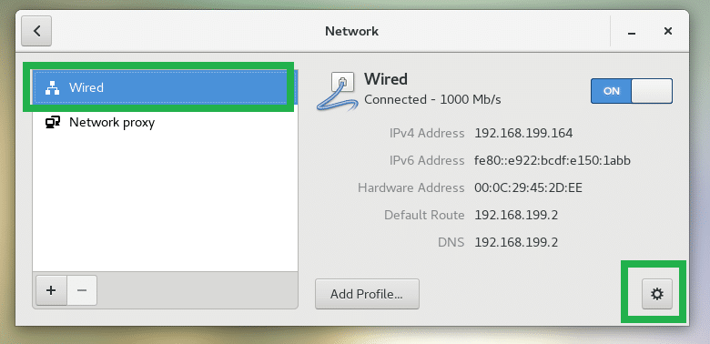 Now select a connection and click on the gear icon as marked in the screenshot below. In my case, I selected the Wired connection.