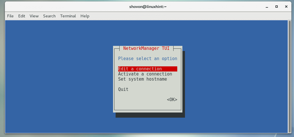nmtui should start. Now select Edit a connection and press <Enter>.