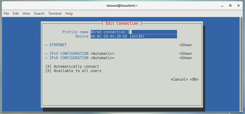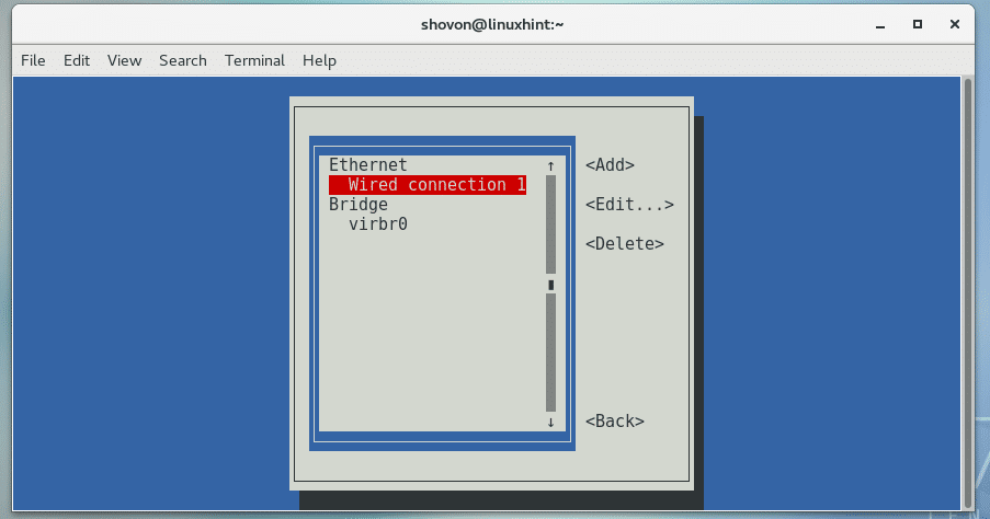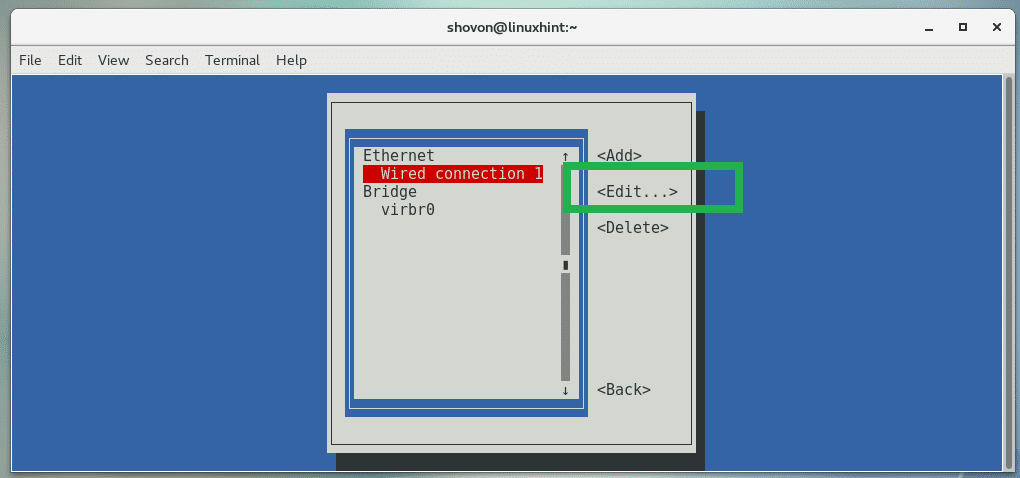 You should see the following window. All your connections should be listed here. To set static IP for a connection, select it and navigate to <Edit…> and then press <Enter>. I am going to set static IP for the Wired connection 1 connection.