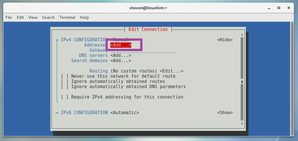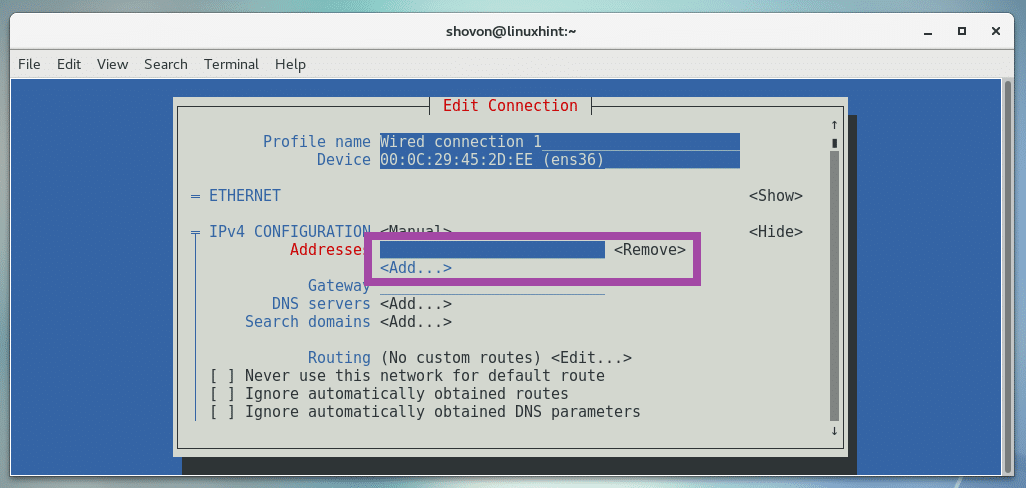 Now to add an IP address, go to Address <Add…> and press <Enter>.
