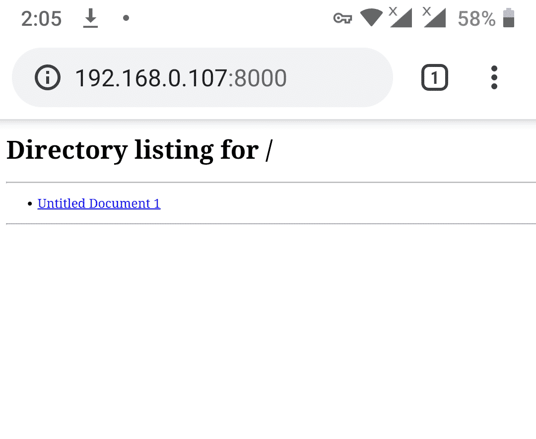 Enter the IP address obtained above in the URL. The correct URL to access the file server now would be: “http://192.168.0.107:8000/”. You can open this URL in any web browser on any device to download the listed files. Below is a screenshot of this URL opened on an Android device: