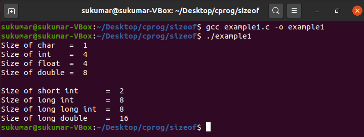 In this program, we will see how the sizeof operator works for built-in data types such as int, char, float, double. Let us look at the program and output.