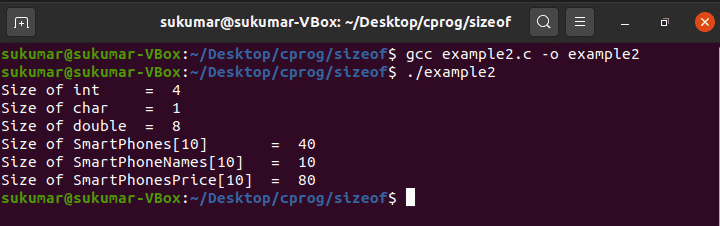In this program, we will see how to use the sizeof operator for different types of array. In case of an array, the sizeof operator will return (No. of elements in the array * Sizeof (array type)). For example, when we declare an integer type array of 10 elements (int SmartPhones [10] ;), the sizeof(Smartphones) will return: