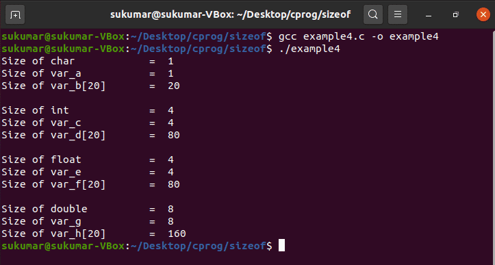 printf("Size of var_b[20] = %ld \n\n", sizeof(var_b));