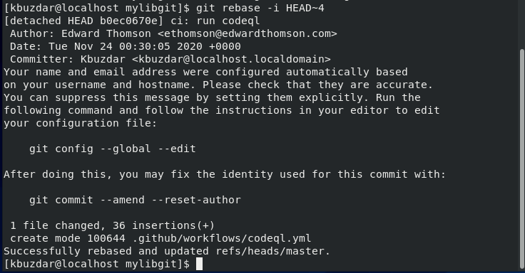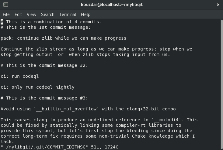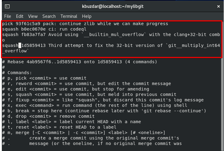 Here, we will mark all commits as squashable, leave the first commit that will be used as a starting point. So, change the vim editor into the insert mode by pressing ‘i’ and change the all pick commit into the squash except the first commit. Now, press ‘Esc’ to change the insert mode and press ‘:wq!’ to save all changes and quit. If you are using the simple text editor then, you can simply change the ‘pick’ word into the ‘squash’ and save changes. After that, you will see the following window on the terminal: