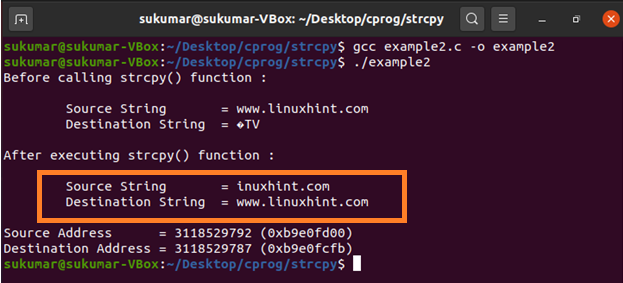 But, still, we are calling the strcpy() function to copy the source string to destination string. From the below output, we can see the strcpy() did not complain at all. In this case, the strcpy() function will start copying the character from the source string (until it finds the NULL character in the source string) to the destination address (even though destination boundary exceeds). That means the strcpy() function does not do any boundary checking for destination array. Eventually, the strcpy() function will overwrite the memory addresses which are not allocated to the destination array. This is why the strcpy() function will end up overwriting the memory locations which might be allocated to a different variable.
