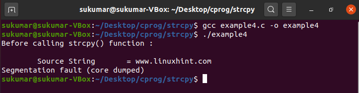 We have considered this program as an example to show that we should never call strcpy() with a string literal as the destination. This will cause undefined behavior and eventually, the program will crash.