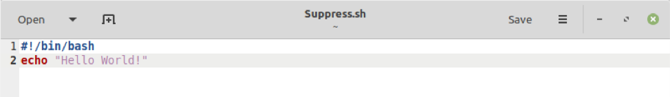 We have created a simple Bash script in which we are just printing a random message on the terminal. We will be using this Bash script in Example # 1 and Example # 2. This Bash script is displayed in the affixed image. We have named our Bash file as Suppress.sh.
